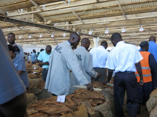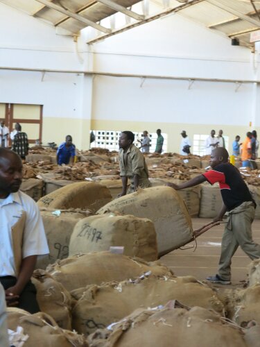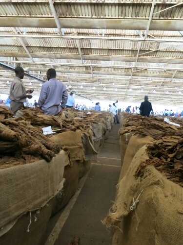 Omdat ik zo weinig van malawi wist ben ik vanochtend met thijs een kijkje gaan nemen bij de grootste tabaksveiling van het land. We hebben immers in de kleine dorpjes langs de kant van de weg de tabaksplanten zien groeien, geoogst zien worden, gedroogd zien worden, maar waar gaan die stapels gedrooge bladeren nu echt naar toe? Naar de veiling dus. De boeren komen met hun balen vol gedroogde bladeren aan, waar het veilingproces dan begint.
